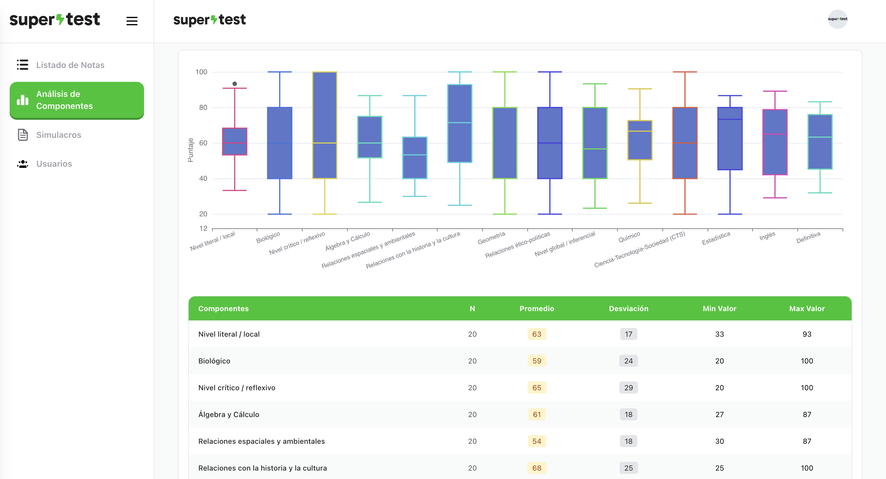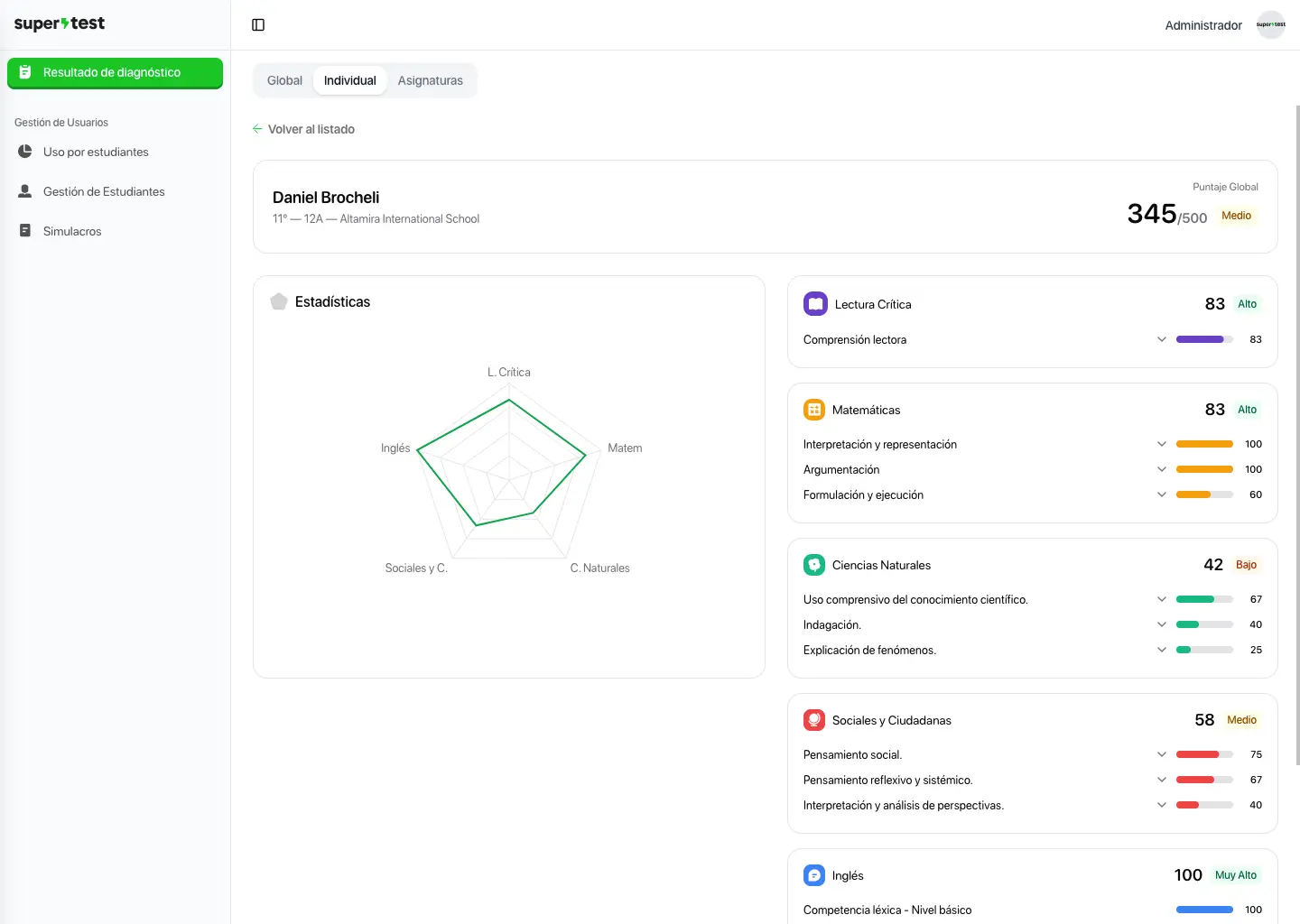 Desde el progreso individual hasta el desempeño institucional, Supertest centraliza la información que tu equipo necesita para mejorar resultados.